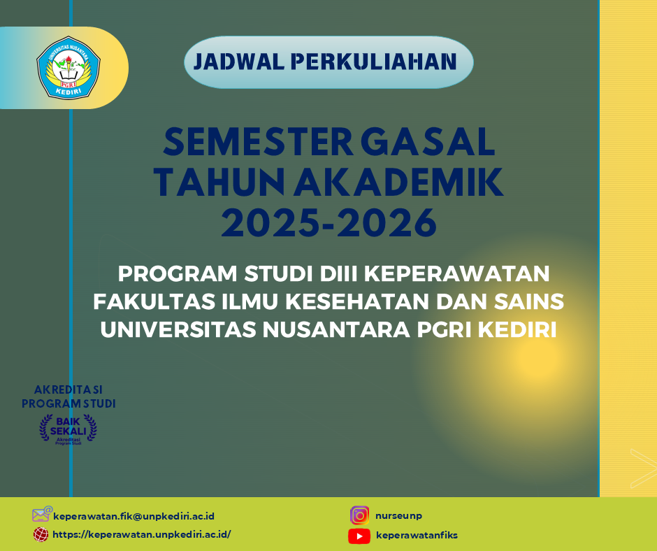 Diberitahukan Kepada Mahasiswa Program Studi DIII Keperawatan Fakultas Ilmu Kesehatan dan Sains Universitas Nusantara PGRI Kediri, berikut ini JADWAL PERKULIAHAN SEMESTER GASAL TAHUN AKADEMIK 2025-2026 sebagai berikut :